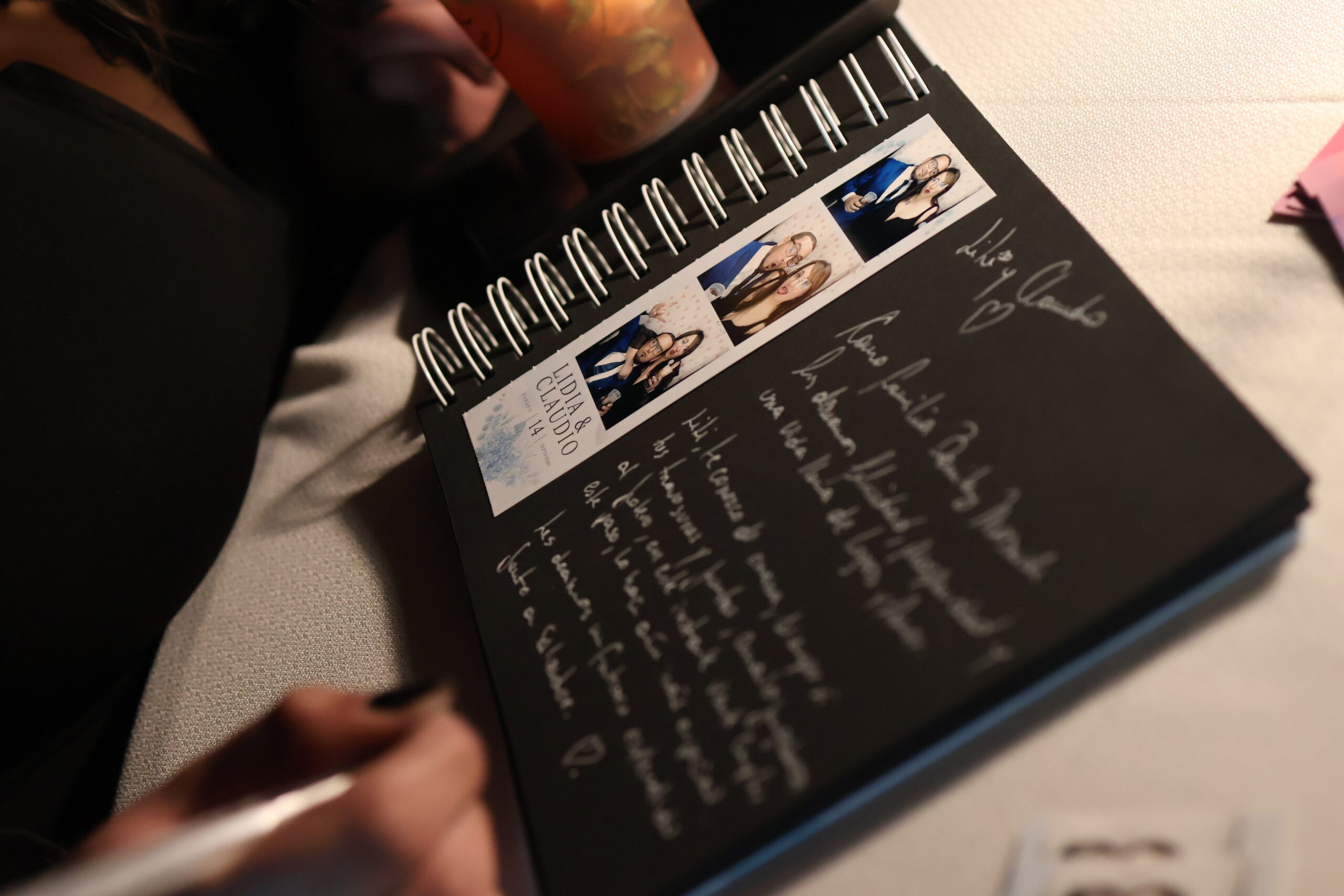 El libro de recuerdos es ideal para matrimonios y licenciaturas. Dentro del libro los invitados pegan una tira de fotos y dedican un mensaje a los novios o profesor jefe.
